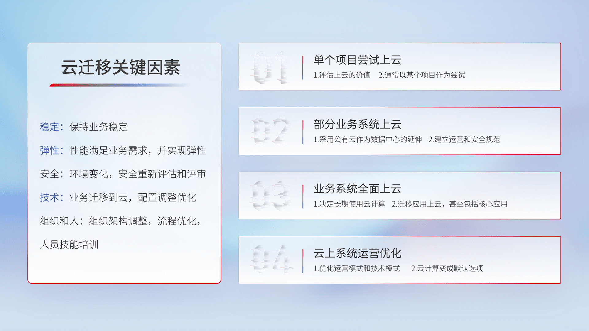 结合实际业务,,,从规划设计、、云平台选型、、、、云原生改造、、、数据迁移、、集成交付,,,,迁移全过程为客户识别最佳上云路径,,做好风险识别管理,,,设计网络架构、、、身份权限、、、安全审计合规、、、操作审计、、、、日志审计、、、、监控告警策略、、多站点容灾设计等,,,对云上基础设施进行整体规划,,,,提升IT治理水平,,,以满足弹性、、、、高可用、、、、高性能的需求。。。